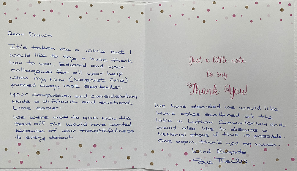 Serving the Fylde Coast has been our Families great pleasure for more than 60 years and we do so with warmth and compassion with the highest dedication to our duty to provide only the finest farewell for your loved ones.
